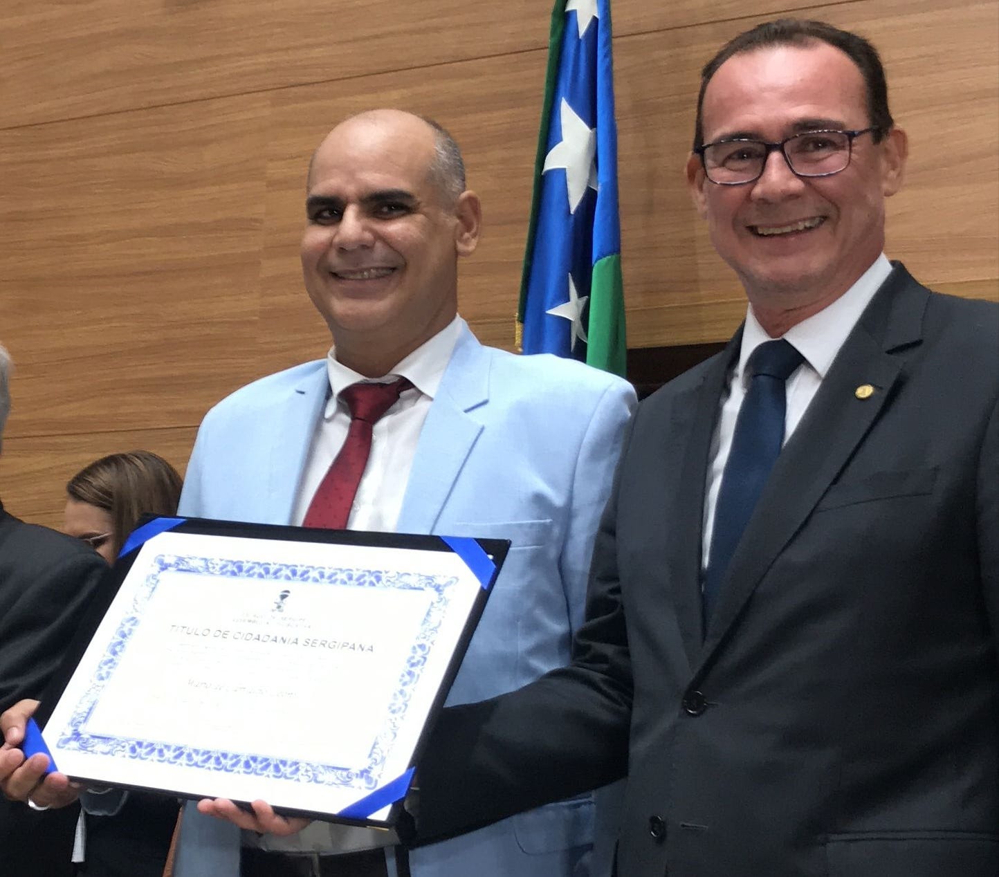 O delegado de Polícia Civil, Mário de Carvalho Leony recebeu durante Sessão Especial na tarde desta segunda-feira, 30, no plenário da Assembleia Legislativa de Sergipe, o Título de Cidadania Sergipana. A homenagem é de autoria dos deputados Zezinho Sobral (PDT), Goretti Reis (PSD) e Gilmar Carvalho (PL) em reconhecimento por todos os esforços e ações para que Sergipe seja sempre um estado seguro, humano e fraterno.